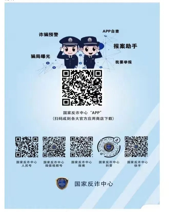防电信诈骗应对措施 一、六个一律 (一)只要一谈到银行卡,一律挂掉电话。 (二)只要一谈到中奖了,一律挂掉电话。 (三)只要一谈到是公检法或银行卡逾期,一律挂掉电话。 (四)所有短信,凡是让点击链接的,一律删掉。 (五)微信、QQ发来的不明链接或二维码,一律不点不扫。 (六)所有以交友为由,推荐投资理财、兼职刷单、代买各类商品等的,一律拒绝、删除。 (一)凡是自称公检法电话办案要求的,都是诈骗。 (二)凡是让你汇款到“安全账户”的,都是诈骗。 (三)凡是通知中奖、领取补贴(如奖助学金、助学贷款等)要你先交钱的,都是诈骗。 (四)凡是通知“家人朋友”出事要求先汇款或转账的,都是诈骗。 (五)凡是在电话中索要个人信息、银行卡信息或短信验证码的,都是诈骗。 (六)凡是让你开通网银(远程操控)接受检查的,都是诈骗。 (七)凡是自称领导(老师)突然要求转账、汇款的,都是诈骗。 (八)凡是陌生网站(链接),要求输入银行卡信息的,都是诈骗。 (九)凡是叫你秘密配合,要求你宾馆开房或到隐蔽场所接受调查的,都是诈骗。 (十)凡是要求你登录网站查看通缉令的,都是诈骗。 携手反诈 赶快下载“国家反诈中心”APP |