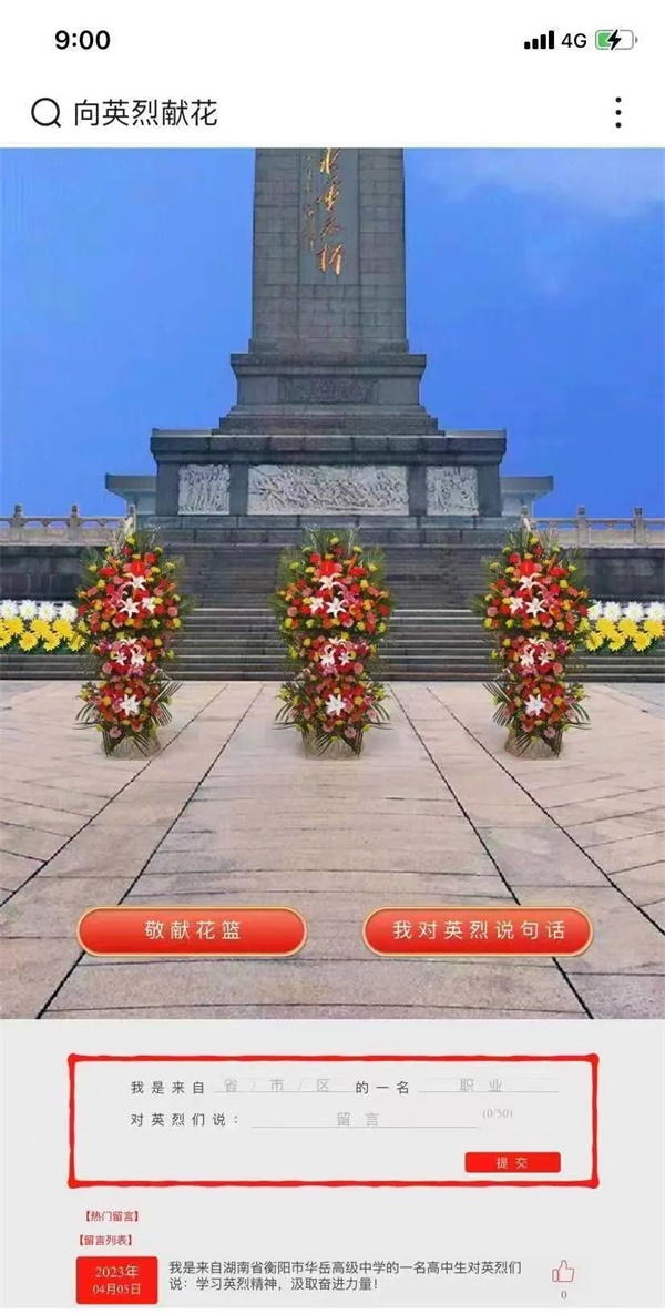 英烈者,国家之骨干、民族之灵魂。对英烈先贤的纪念与褒扬,从来都是一个国家、一个民族应该经常奏响的激昂乐章。 “春草青青万项田,草长莺飞清明时”,清明假期,华岳高级中学开展“‘云’祭英烈·缅怀先贤”线上祭扫活动,向英雄们致敬。 同学们通过书写寄语,摘抄事迹的方式寄托怀念与祝福,登录中华英烈网专题网页献花表达对英烈先贤的崇高敬意。 一个有希望的民族不能没有英雄,一个有前途的国家不能没有先锋。让我们积极行动起来,从自身做起,文明祭扫,以更文明、更绿色、更健康的祭奠方式致敬英烈,慎终追远,寄托哀思! |