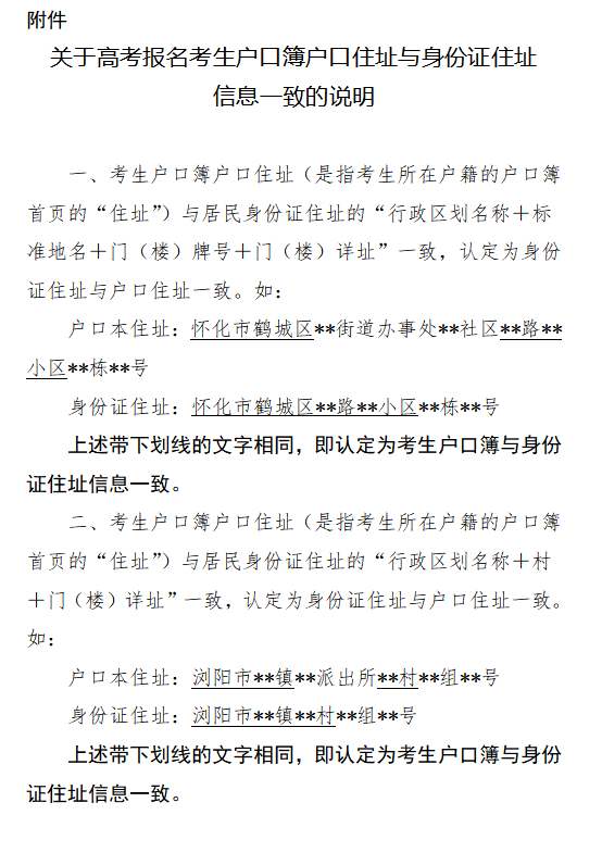 湖南省2024年普通高等学校招生考试(以下简称:高考)报名工作将于2023年10月23日至31日进行,在完成高考报名后,报考艺术类(含对口招生艺术类,下同)、体育类专业的考生还须进行艺术类、体育类统考报名和缴费。2024年艺术类、体育类统考的报名缴费于2023年11月1日至9日进行。具体报名办法及相关要求将于10月上旬前向社会发布。为方便广大考生提前做好各项相关准备,顺利完成高考报名和艺术类统考工作,湖南省教育考试院特作如下重要提示: 一、确保个人身份证和户口证明信息一致有效 高考报名必须采集考生个人二代居民身份证(建议办证时间不早于2022年1月)的基本信息,如身份证遗失或将于2024年9月30日前过期的,考生须尽快到户籍所在地公安部门指定地点补办。考生个人的二代居民身份证信息应与户口簿一致,如因主项信息变更、家庭住址搬迁、行政区划调整等导致户籍发生变更的,须及时到公安部门办理新户口簿和二代居民身份证,确保户口簿、二代居民身份证信息与当前公安部门户籍信息一致(关于高考报名考生户口簿户口住址与身份证住址信息一致的说明见附件)。居民身份证是高考报名、考试、录取、大学报到注册的重要身份证明,考生使用身份证报名确认后,在进入大学报到注册之前,切记不要修改身份证的关键信息(如姓名、照片、性别、出生年月日、民族等),以免因信息不一致,影响今后考试、录取、大学报到注册等。 二、外省户籍进城务工人员随迁子女注意事项 外省户籍考生如不符合我省高考报名条件的,须及时关注户籍地省级教育考试机构发布的报考动态并在规定时间返回户籍地参加高考报名;在外省就读的湖南户籍考生,如不符合就读地随迁子女高考报名政策,须在规定时间内返回户籍地所在县(市区)考试招生机构办理高考报名手续。学籍在我省的外省户籍进城务工人员随迁子女应提前向学籍地县(市区)考试招生机构咨询相关政策流程,符合我省高考报名条件的,准备好报名相关材料,避免因准备材料错过报名时间及相关报名安排。 三、具有高校学籍的考生不能参加高考报名 根据教育部有关规定,具有高等学历教育资格的高校在校生或已被高校录取并保留入学资格的考生不得参加高考报名。请考生及时了解情况并妥善处理,避免高考报名后因资格审核不合格而被取消报名资格。 四、艺术类统考有关安排 根据《关于印发湖南省2024年普通高校艺术类专业考试招生工作实施方案的通知》(湘教考发〔2023〕1号)有关规定,2024年音乐类、舞蹈类、表(导)演类、播音与主持类、美术学与设计类、书法类6个科类的省级统考由我省统一组织实施,各科类考试科目及考试命题依据为《湖南省普通高等学校艺术类专业统一考试音乐类、舞蹈类、表(导)演类、播音与主持类、美术与设计类、书法类专业考试说明》(湘教考命字〔2023〕2号),部分类别的面试将采取“考评分离”方式,6个科类的省级统考将于2023年12月2日陆续开始,具体操作办法及相关要求将于11月上旬前向社会发布。戏曲类考试内容、考试形式及考试时间按照教育部有关规定另行通知。 五、及时关注权威发布渠道 广大考生及家长须及时关注湖南省教育考试院(http://jyt.hunan.gov.cn/sjyt/hnsjyksy/)、湖南招生考试信息港(https://www.hneeb.cn/hnxxg/)、湖南考试招生微信公众号(hunan-zhaokao)等官方媒体发布的相关信息。高考有关政策规定、信息动态将通过上述权威渠道及时发布。 附件:关于高考报名考生户口簿户口住址与身份证住址信息一致的说明 湖南省教育考试院 2023年9月15日 |