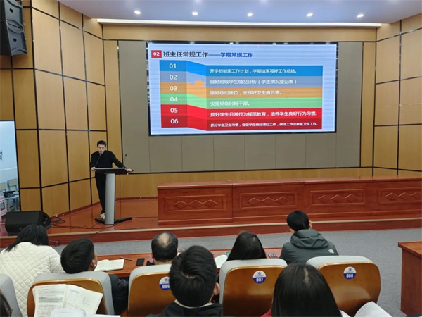 为进一步加强班主任队伍建设,总结和推广班级管理经验,促进班主任专业成长,12月6日,我校在报告厅召开了班主任工作总结暨经验分享会。会议由德育处副主任唐弦主持。 德育处主任廖丽萍对十一月份的班级考核情况作总结,希望班主任抓实日常管理,关注学生心理健康,护航学生健康成长。 全才龙老师作为班主任代表发言,他分享了班级卫生和纪律管理方面的经验,强调安排到位,落实到人,每天一小结,两周一总结。 德育副校长赵献忠作总结发言,肯定了班主任工作成绩,也指出了常规管理、班级建设等方面存在的问题,并强调教学为重,德育为先。班主任要对学生的生活、学习各方面进行精细化管理,重视学生行为习惯的培养。 此次会议结束后,班主任纷纷表示:将总结经验、智慧管理、蓄力前行。 |
