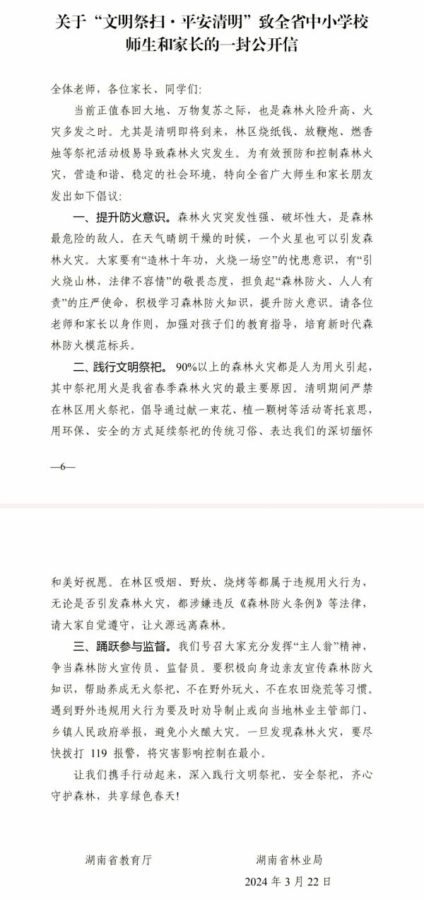 尊敬的家长: 您好!感谢您一直以来对我校工作的大力支持与配合。清明将至,为共度平安、文明、祥和的假期,现作温馨提示如下,请您关注。 安全提醒 ●密切关注天气变化,教给孩子应对雷雨大风、冰雹、短时强降水等灾害性天气的知识,提高个人防护意识和能力。 ●遵守交通规则,注意乘车安全,不搭乘“三无”车等非运营车辆。搭乘摩托车、电动车时,请注意佩戴安全头盔。 ●告诫孩子不要私自到河、塘以及水库等地方玩耍,以防意外溺水事故。教育孩子不玩火、不玩电,以免发生事故。学会遇到紧急情况使用报警电话110、急救电话120和火警电话119。不在公路上和高压线下放风筝。 ●请教育孩子放假离(返)校时,不要在路上推搡追逐、嬉戏打闹,避免意外伤害事故的发生。 文明祭祀 清明扫墓请遵守衡阳市政府要求和当地乡规民约关于文明祭扫的相关规定,加强消防意识。倡导鲜花祭扫、踏青遥祭或网络追思等祭祀方式,寄托哀思、礼敬先人。 关于“文明祭扫·平安清明”致全省中小学校师生和家长的一封公开信