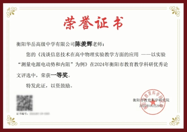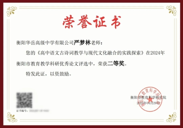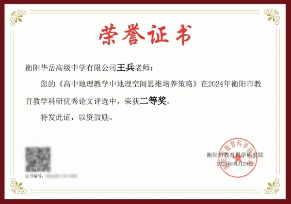 【喜报】衡阳华岳高级中学五位教师论文获奖 访问人数:638 新闻作者: 新闻来源: 发布时间:2025-5-15 10:31:02 在2024年衡阳市教育教学科研优秀论文评选中,我校陈羡辉老师荣获一等奖;陈洪松老师、黄华仕老师、王兵老师、严梦林老师荣获二等奖。 衡阳华岳高级中学2025年5月 华岳高级中学始终秉持科研兴校理念,此次获奖既是教师个人专业能力的体现,更是学校教研生态建设的成果。 三尺讲台育桃李一支粉笔写春秋 向所有获奖教师表示热烈祝贺 让我们以优秀者为榜样共同书写教育创新的精彩篇章