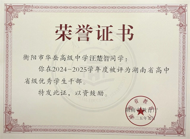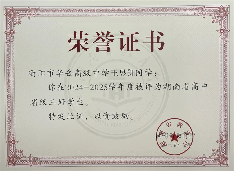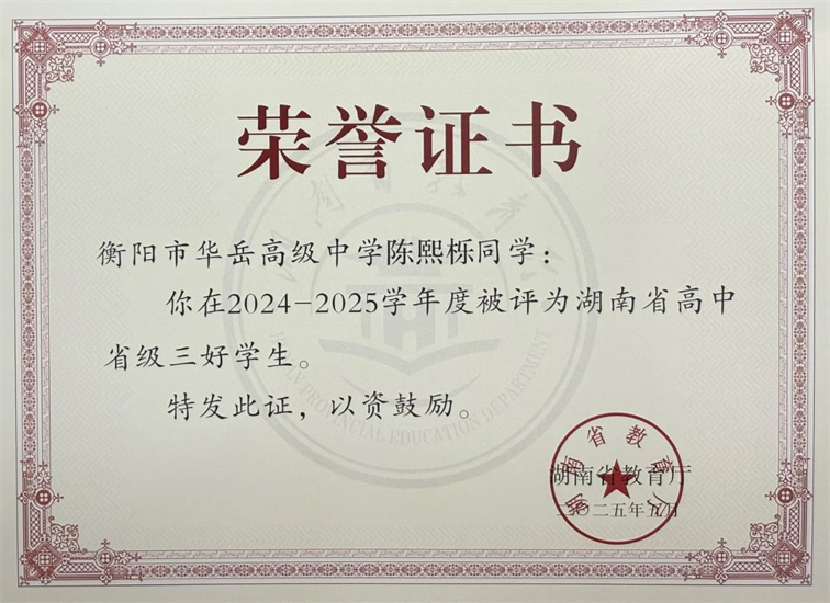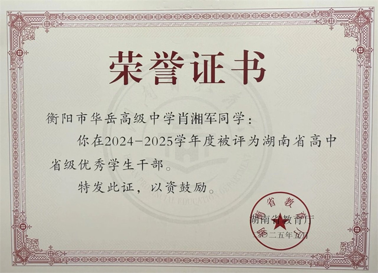 喜 报 经学校推选、衡阳市教育局评议审核、省教育厅评定公示,我校陈熙栎、王昱翔、曾智文三位同学被评选为2024~2025学年度湖南省普通高中“省级三好学生”;汪楚智、肖湘军两位同学获评“省级优秀学生干部”荣誉。 |