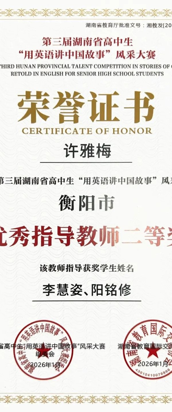 【喜报】衡阳华岳高级中学教师荣获英语省赛多个奖项 访问人数:93 新闻作者: 新闻来源: 发布时间:2026-3-6 9:18:08 在第三届湖南省高中生“用英语讲中国故事”风采大赛中,我校张珊珊、许雅梅、梁丽云、熊璐、周珣、彭蕾、肖涵七位老师荣获多项奖项!